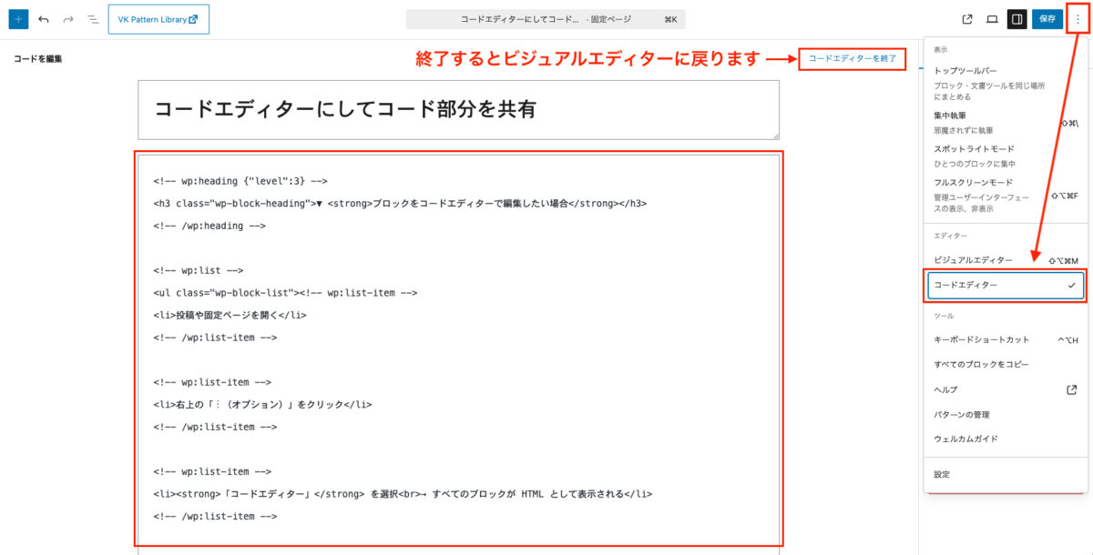 - 「コードエディター」 を選択